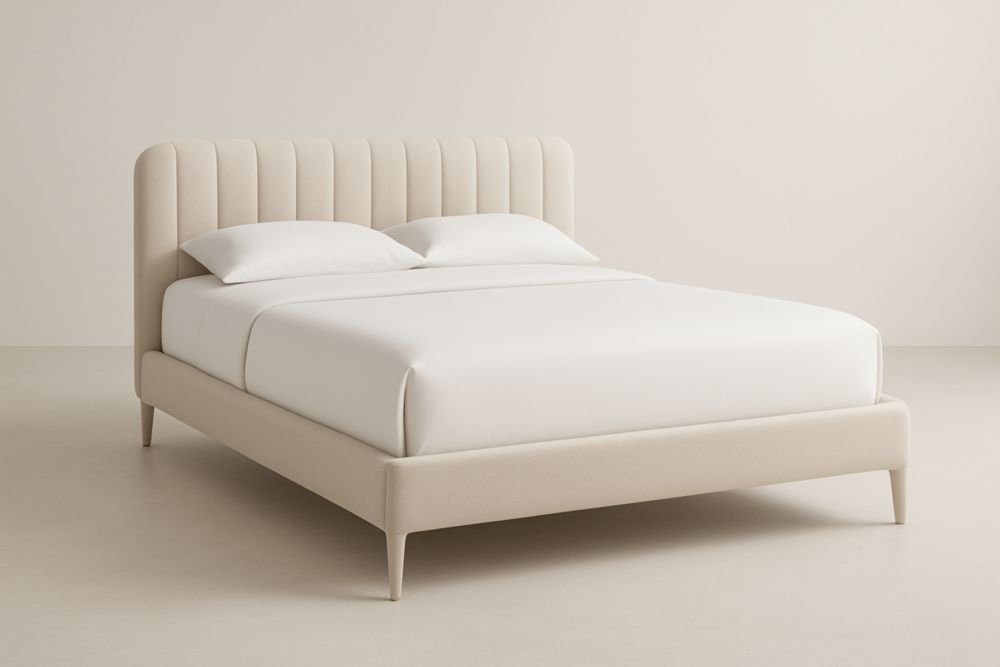Letto matrimoniale in tessuto poliestere beige con struttura in legno massello 200x160x120 cm