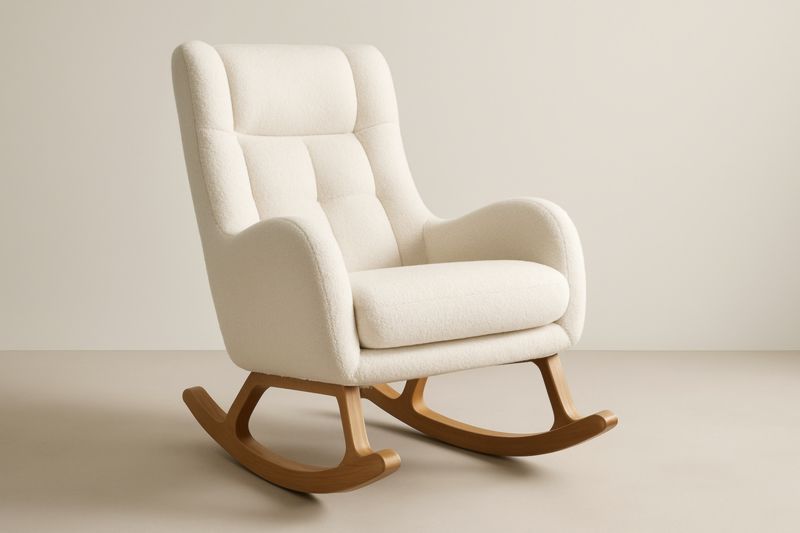 Sedia a Dondolo in Tessuto Poliestere Bianco con Struttura in Legno di Quercia